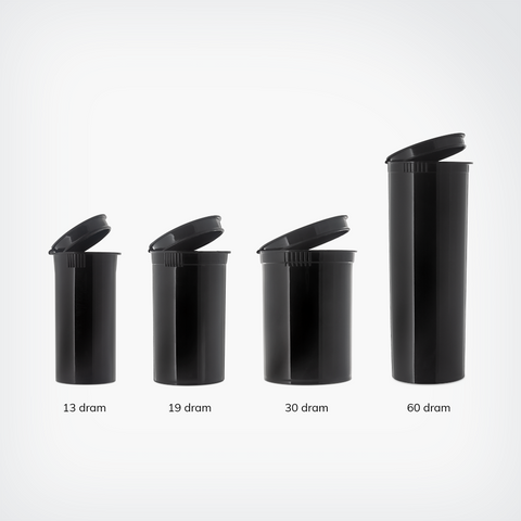 Pop Top or Squeeze Top vials are certified child-resistant and made with FDA food safe materials. These vials have been protocol tested per CFR Title 16 Part 1700 and are compliant with Consumer Product Safety Commission standards. Available in a range of opaque colors and sizes.
