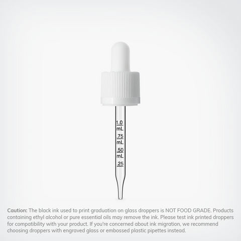 Caution: The black ink used to print graduation on glass droppers is NOT FOOD GRADE. Products containing ethyl alcohol or pure essential oils may remove the ink. Please test ink printed droppers for compatibility with your product. If you're concerned about ink migration, we recommend choosing droppers with engraved glass or embossed plastic pipettes instead.